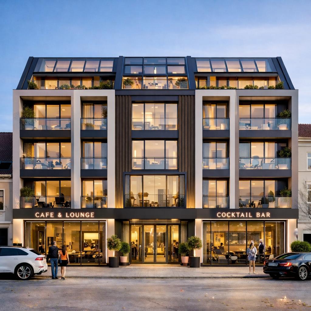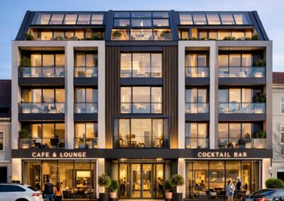 Im Erdgeschoss öffnen sich ein Café & Lounge Bereich sowie eine Cocktailbar zur Straße hin und schaffen eine lebendige Schnittstelle zwischen Innen- und Außenraum. Die oberen Etagen beherbergen moderne Zimmer und Aufenthaltsbereiche, die durch große Fensterflächen lichtdurchflutet sind und einen hohen Wohn- und Aufenthaltskomfort bieten. Besonderes Augenmerk wurde auf eine hochwertige Materialität sowie eine warme, einladende Atmosphäre gelegt. Balkone und dezente Beleuchtungskonzepte unterstreichen den zeitgemäßen Charakter des Gebäudes und sorgen für eine angenehme Aufenthaltsqualität – sowohl für Gäste als auch für Besucher.