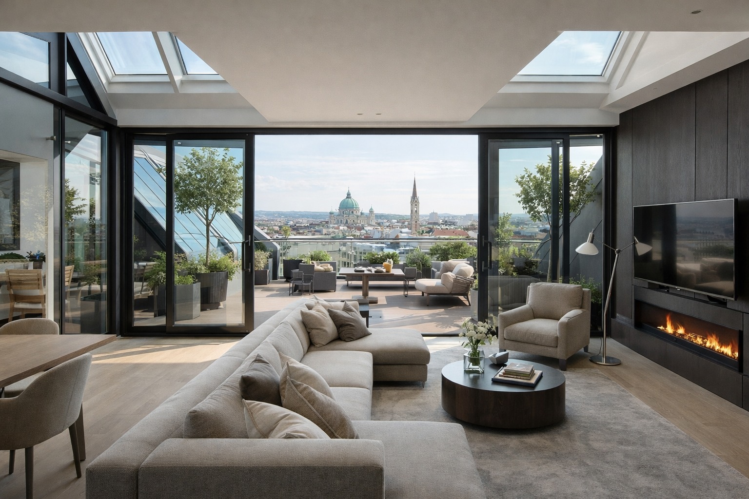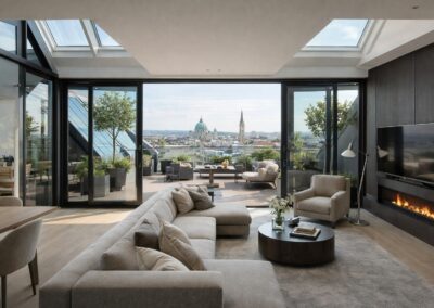 Im Zuge des Projekts wurde das Dachgeschoss neu ausgebaut und um eine Gesamtnutzfläche von rund 650 m² erweitert. Durch die präzise Planung und die künstlerische Oberleitung entstand ein Wohnkonzept, das sich sensibel in die bestehende Gebäudestruktur einfügt und gleichzeitig moderne architektonische Akzente setzt.